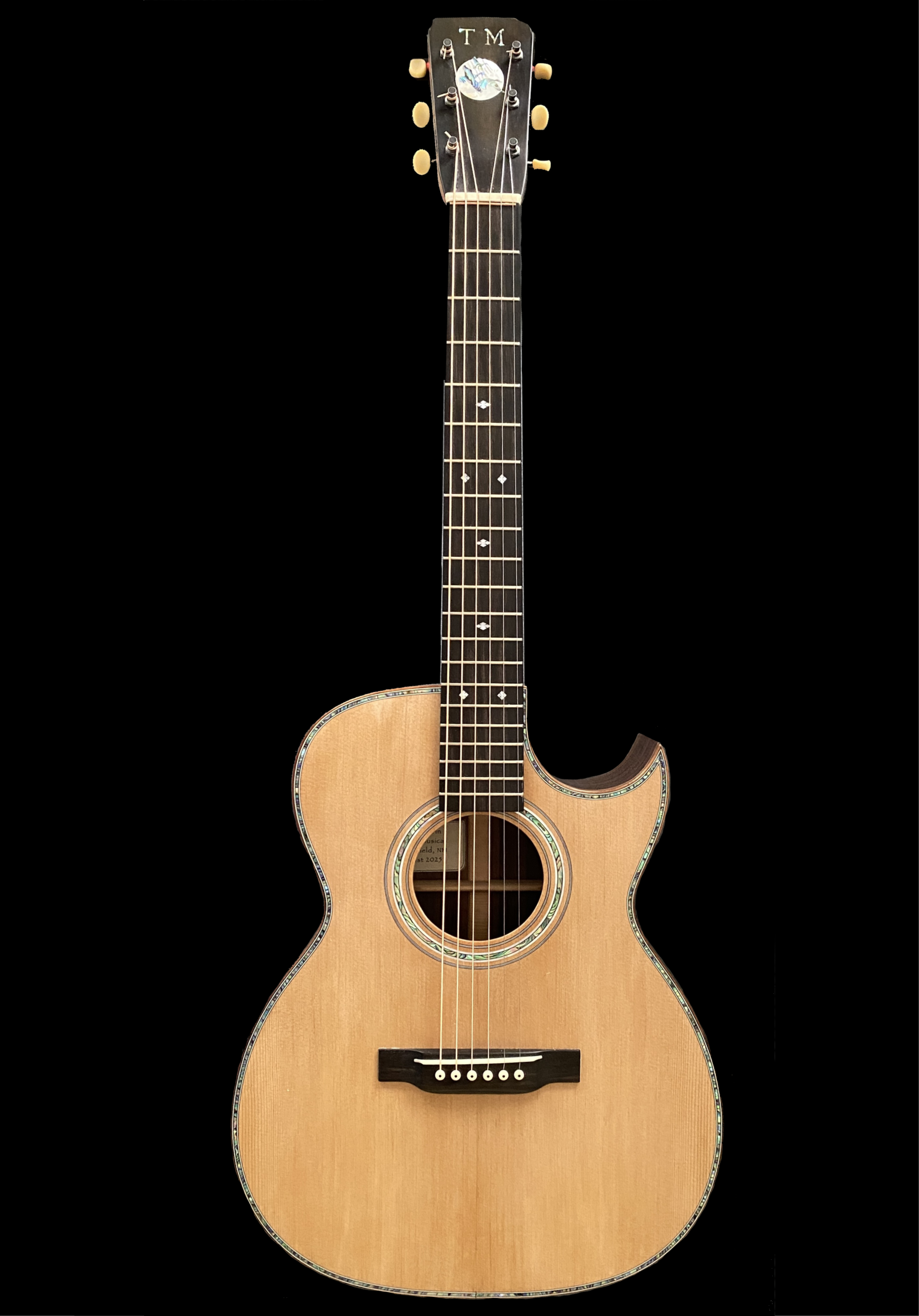 A custom guitar decorated with bloodwood and green abalone Tourin Musica 2025