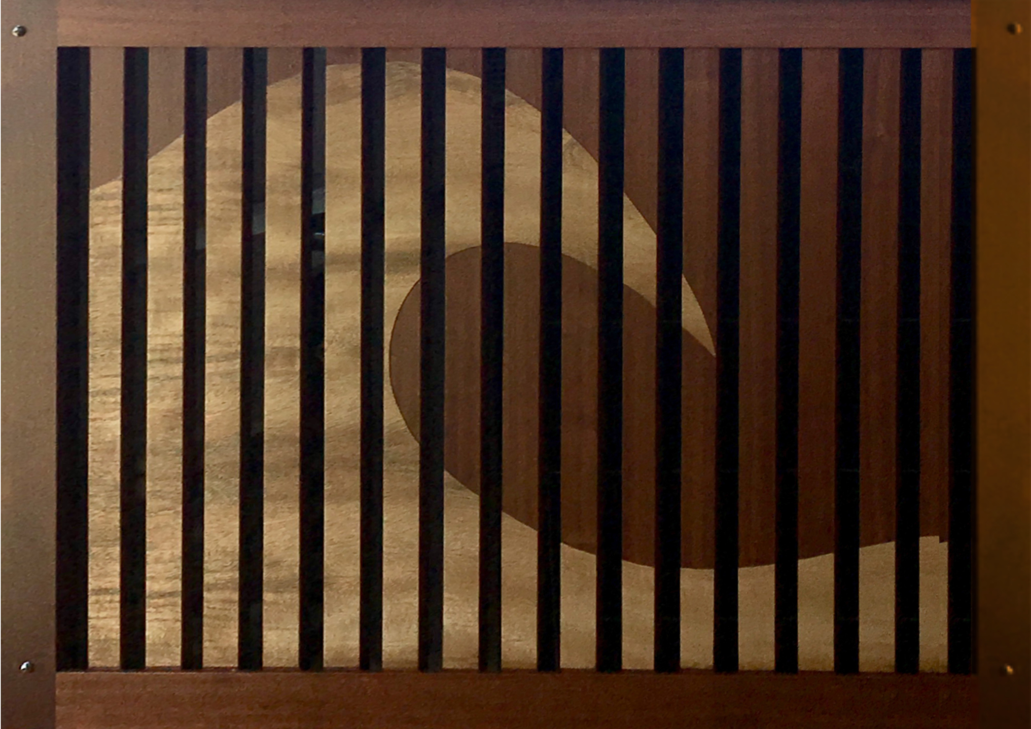 A custom mango and sapele marquetry panel covers utilities on a lanai in Wailea