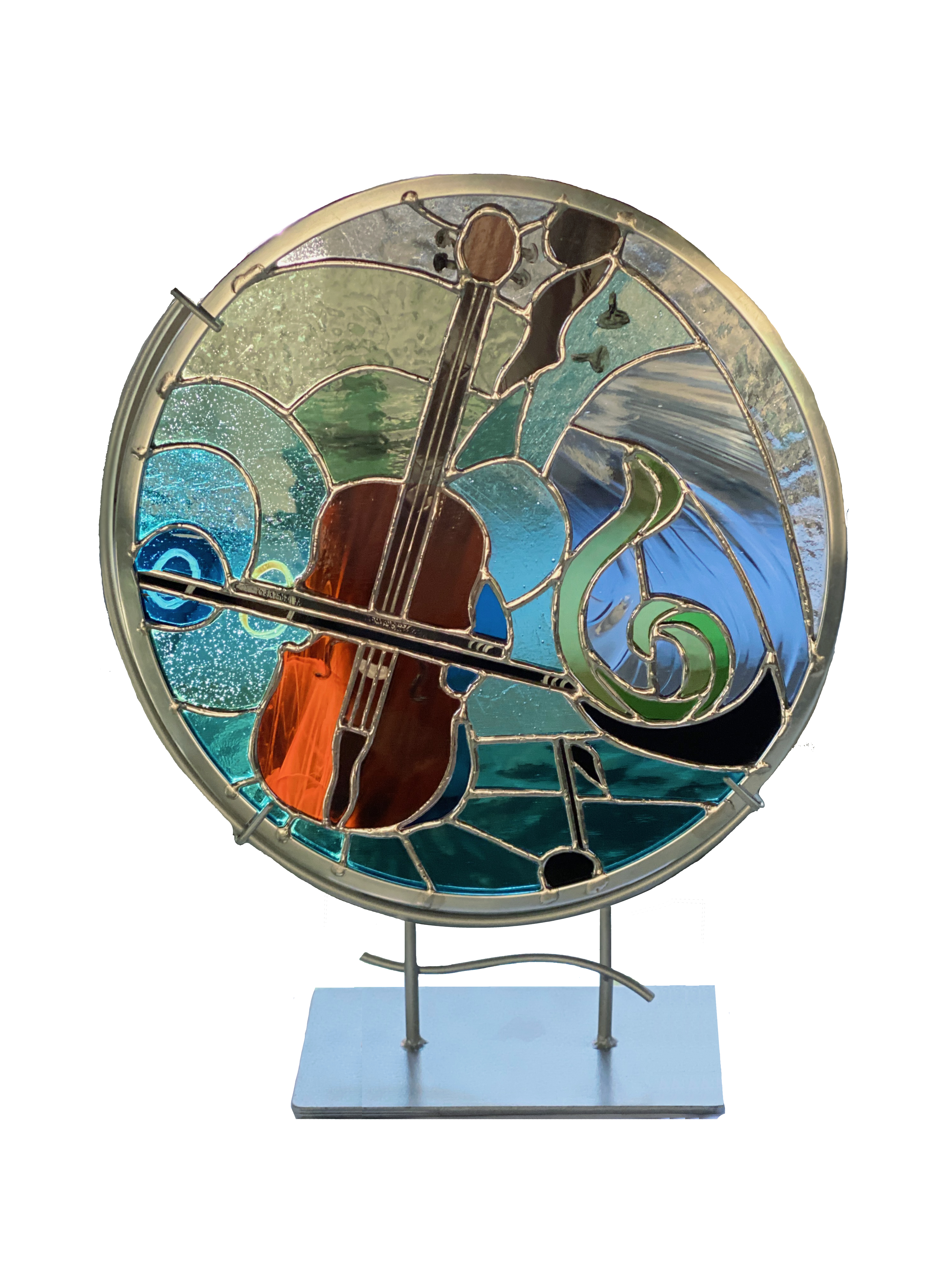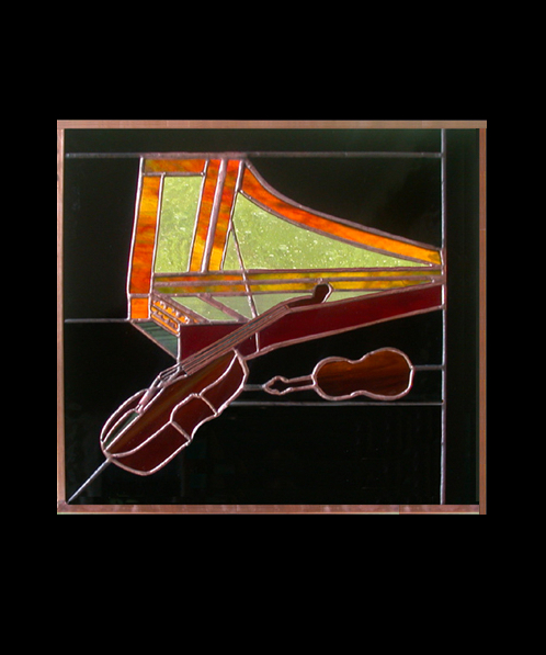 Musicians at rest during a rehearsal break. Cello, violin, and harpsichord captured in a stained glass window for Arcadia Players, Northampton, MA.