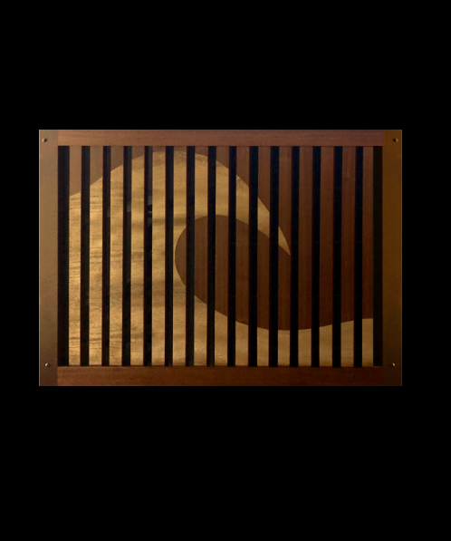 An outdated mirrored set of closet doors is transformed to meditative state with rice paper and an artful figured sapele wood design. 2019