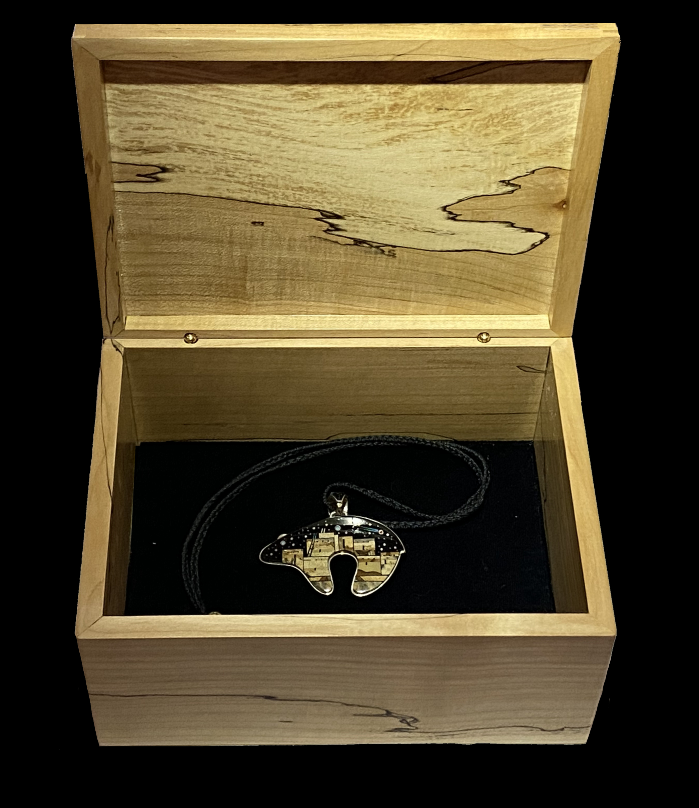 A spalted maple jewel box with book-matched sides and decorated with green abalone purfling.
